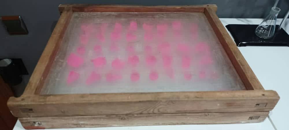 Le grand cadre en bois avec un verre au milieu que vous voyez ici date de 1945-1946. Il a servi de très nombreuses fois car c’était une méthode d’extraction très populaire à l’époque. Comme cela demande assez bien de manipulations et que la main d’œuvre est chère à notre époque, on ne s’en sert plus beaucoup de nos jours.