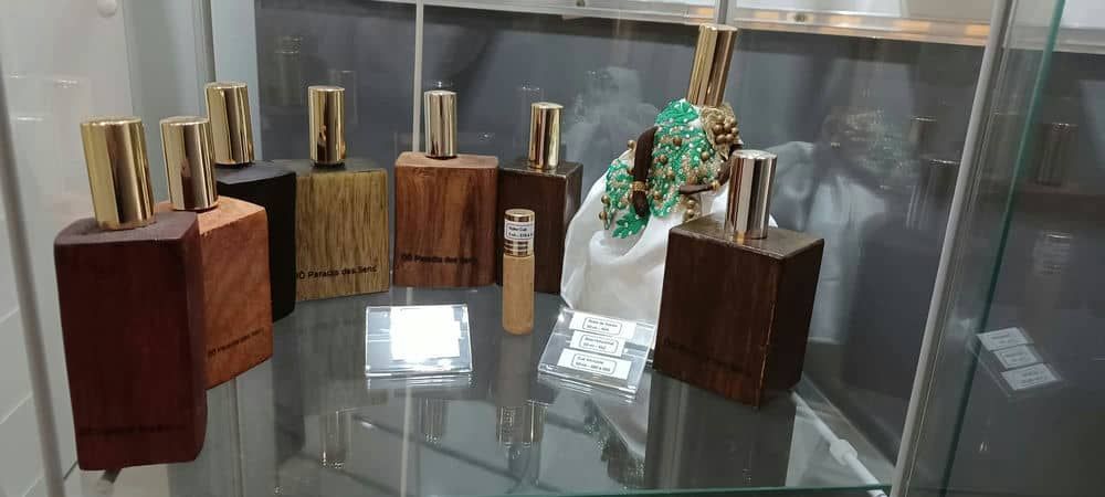 Sur l’avant dernière étagère vous pouvez voir nos flacons de 50 ml en Cuir véritable. Leur fabrication n’a pas été facile non plus pour arriver à un tel résultat ! Nous proposons également de petits flacons Roller de 5 ml en Cuir Véritable. Ils sont très pratiques pour glisser dans votre sac à main ou lors de vos voyages en avion.