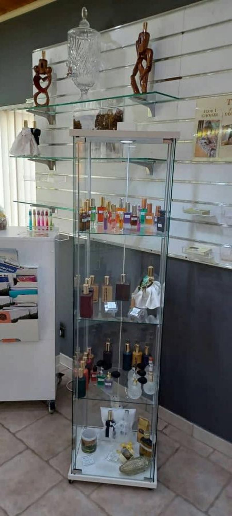 Sur la deuxième étagère en partant du haut vous découvrirez nos superbes Flacons Artisanaux qui sont très originaux et que vous ne trouverez nulle part ailleurs. Leur réalisation a exigé de longs mois de recherche pour arriver à les réaliser !