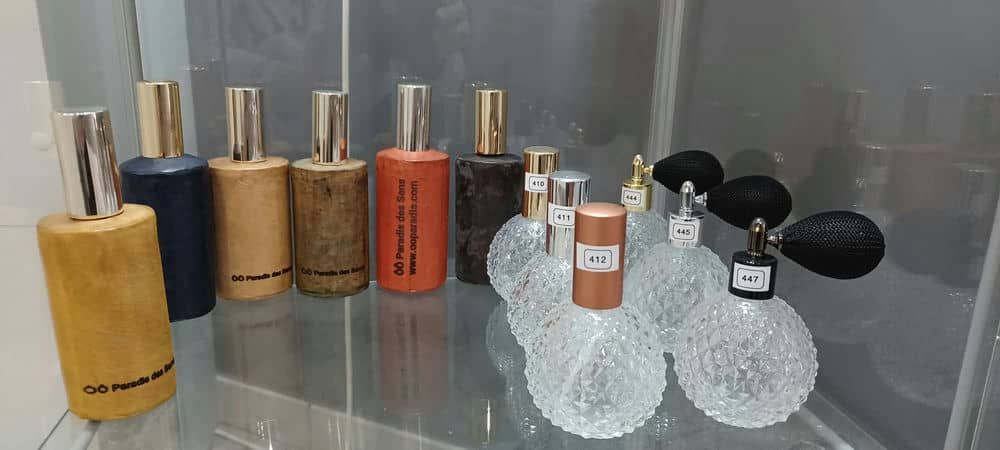 Sur l’avant dernière étagère vous pouvez voir nos flacons de 50 ml en Cuir véritable. Leur fabrication n’a pas été facile non plus pour arriver à un tel résultat ! Nous proposons également de petits flacons Roller de 5 ml en Cuir Véritable. Ils sont très pratiques pour glisser dans votre sac à main ou lors de vos voyages en avion.