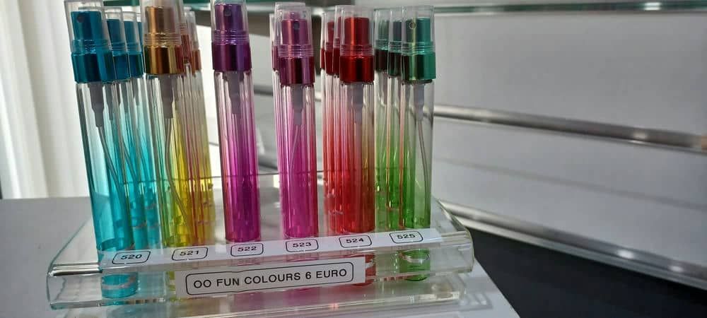 Sur l’étagère supérieure, vous pouvez admirer une collection de flacons de parfum « classiques ». Ils sont de différentes capacités : 5 ml en version « rollers » et en version « spray » 10 ml – 30 ml – 50 ml et 100 ml.