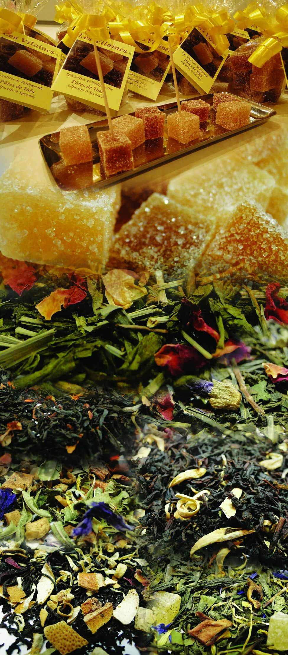 Les friandises que vous avez devant vous ne sont pas des Pâtes de Fruits mais plutôt des Pâtes de Thé qui s’appellent les VILAINES, une spécialité de la ville de Philippeville où a été conçue la 1ère Parfumerie en 2017. Ces étonnants bonbons sont fabriqués à 95% avec les Thés que vous avez sentis dans la Salle Principale. On a juste ajouté un peu de sucre pour bien rehausser le goût du thé. On a également utilisé ½ pomme par 2 Kg de pâte pour rendre solide ce délicieux bonbon en y apportant de cette façon la pectine nécessaire. La personne à l’accueil va vous offrir une Vilaine en dégustation.