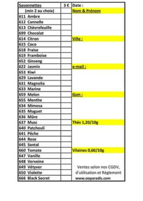 La personne qui est à l’entrée / accueil va vous donner un petit formulaire. Merci de remplir en CARACTERES D’IMPRIMERIE vos Prénom + Nom + Ville et Pays – GSM – E-mail + Date du jour. Vous rendrez cette feuille avant de partir. Ce petit formulaire vous servira également pour cocher les différents produits qui vous intéressent gardez-la ainsi avec vous tout au long de votre parcours.